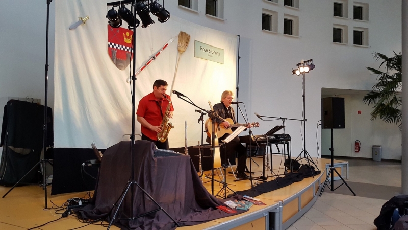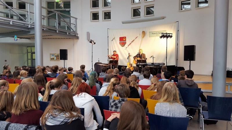 Am 31. Januar 2017 kam die Künstlergruppe Rose und Georgi aus Berlin in unser Gymnasium. Die Aufführung fand in der Aula statt. Für die 6. Klassen war das Thema Fabeln vorbereitet. Sie führten „Der Ochse auf der Löwenhochzeit“ auf und noch vieles mehr. Für die 7. Klassen wurden Balladen aufgeführt z. B. „Der Handstand auf der Loreley“. Die Musik spielte dabei eine besondere Rolle. Meist wurden die Texte von Detlev Rose gesungen und musikalisch von Christian Georgi begleitet. Es war eine gelungene Aufführung!