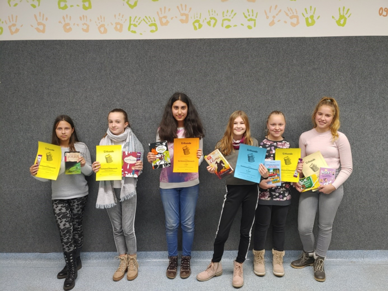 Nicht nur einen eigenen Text sicher und atmosphärisch wirksam lesen, sondern ebenfalls einen völlig fremden Text hinsichtlich der Lesetechnik und der Stimmung sehr gut vortragen – dass sie diese schwierige Aufgabe bemerkenswert meistern, stellten am Mittwoch, den 11.12.2019, sechs Schülerinnen der sechsten Klassenstufe unter Beweis. Jeweils zwei Vertreterinnen aus jeder Klasse waren im Vorfeld von ihren Mitschülern aufgrund ihrer hervorragenden Leseleistung ausgewählt worden, die eigene Klasse im Schulentscheid des Vorlese-Wettbewerbs zu vertreten. Nachdem diese Herausforderung überwunden war, mussten sich die Gewinnerinnen den Besten aus den anderen Klassen stellen. Dafür bereitete jede einen dreiminütigen Lesevortrag eines selbstgewählten Textes vor, während der anschließend gelesene Fremdtext von den Juroren, den Deutsch-Fachlehrern, ausgesucht wurde (Judith Kerr „Als Hitler das rosa Kaninchen stahl“). Trotz der durchweg sehr guten Leistungen auch von Grace Kelly, Mira, Michelle, Anni und Emma konnte es am Ende nur eine Siegerin geben: Samira aus der 6c, welche als eigenes Buch „Bleibt locker, Leute!“ von Dagmar Geisler las und nun zu Beginn des neuen Jahres die Schule beim Kreisentscheid des Vorlesewettbewerbs vertreten wird. Aber auch für die anderen Teilnehmerinnen gab es in Anerkennung ihrer tollen Leistung kleine Preise – für die ersten drei Plätze sogar Buchgutscheine der Buchhandlung Albrecht aus Gardelegen, die der Förderverein des Gymnasiums gesponsert hat.